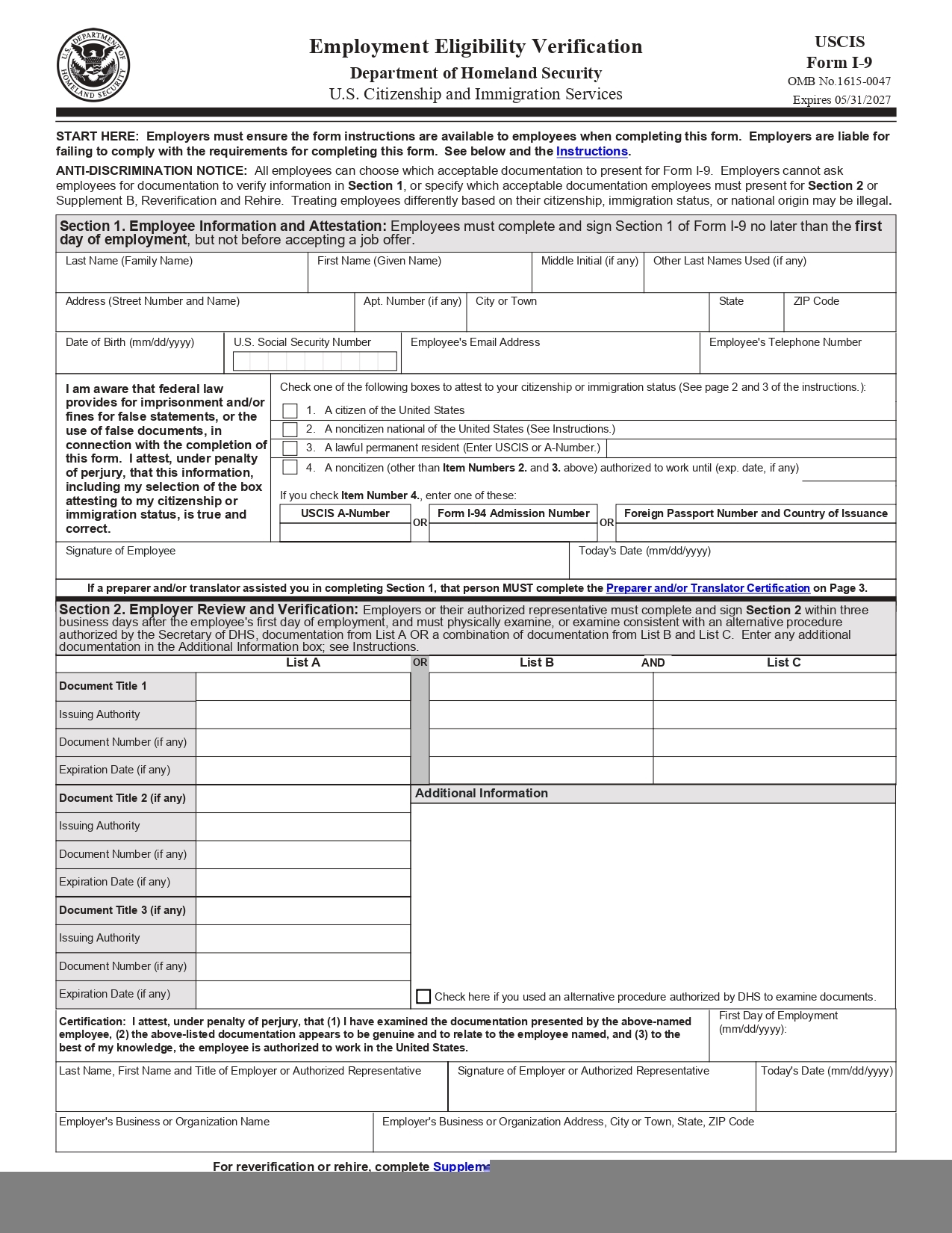 I 9 Form 2025 Printable Employment Eligibility Verification IRS Tax