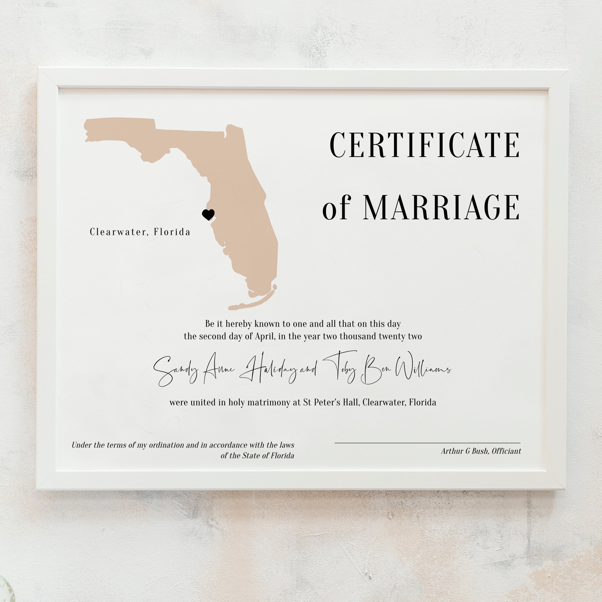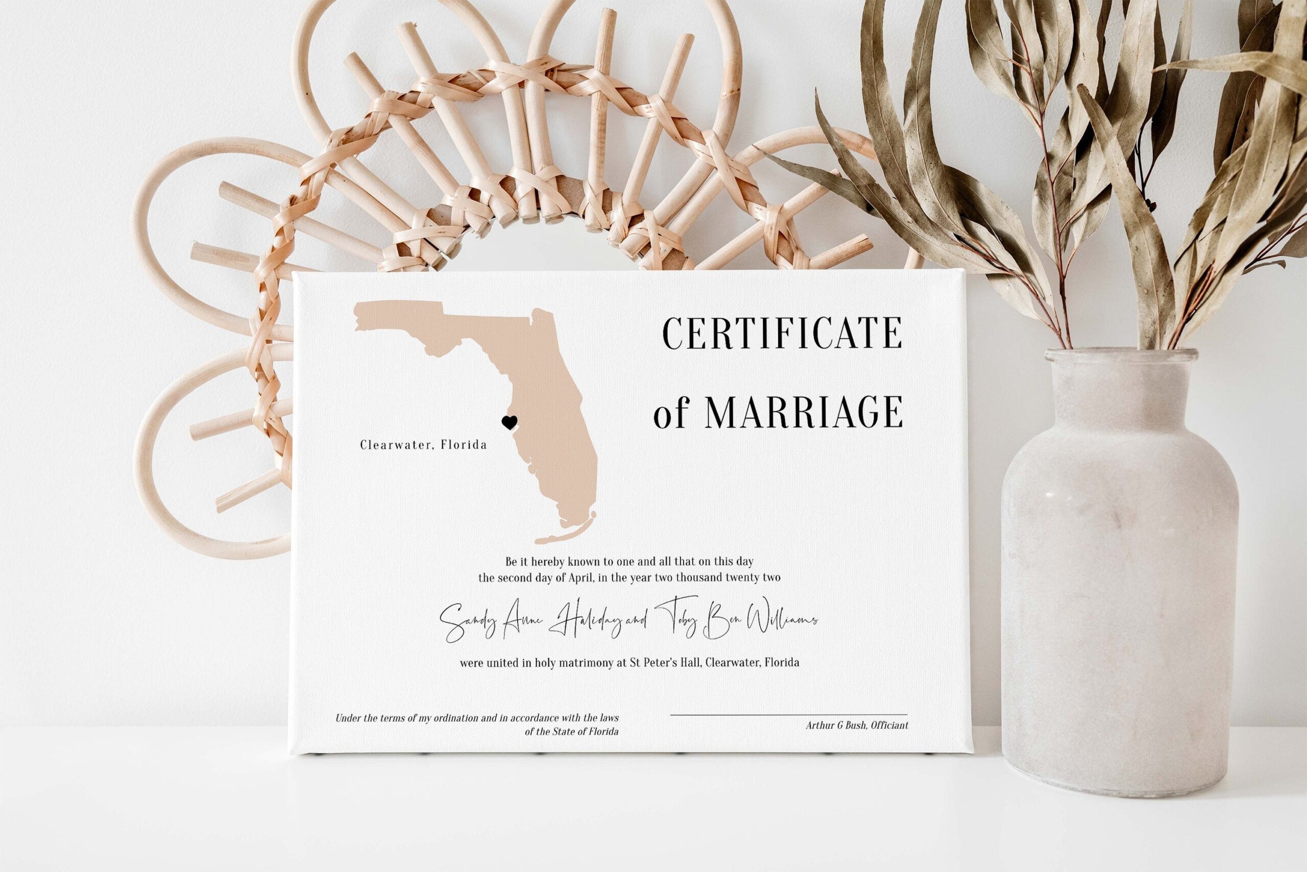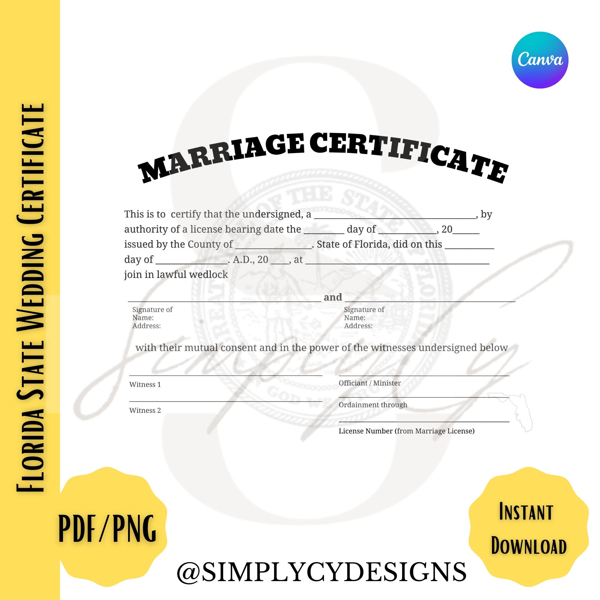 Florida Marriage Certificate With State Seal Downloadable Wedding