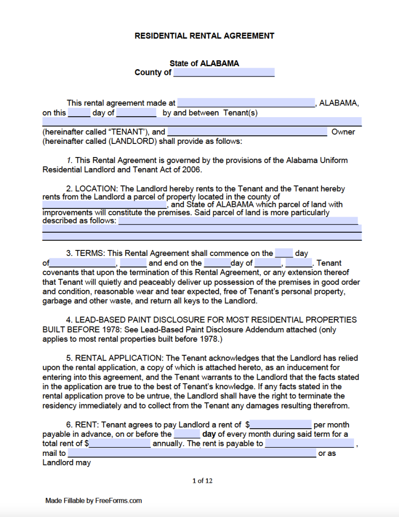 2025 – Free Printable Alabama Rental Agreement