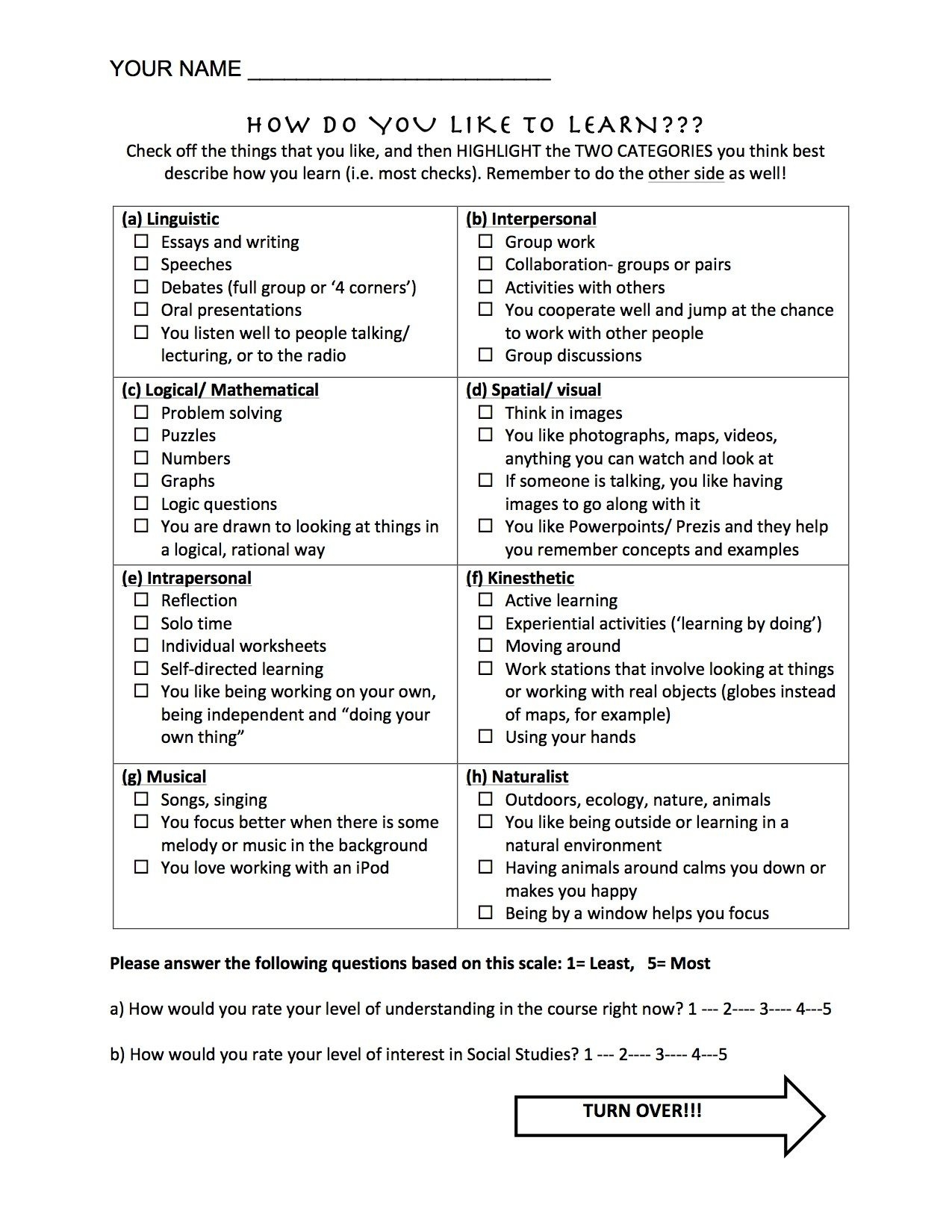 Free Printable Learning Style Inventory Sheets