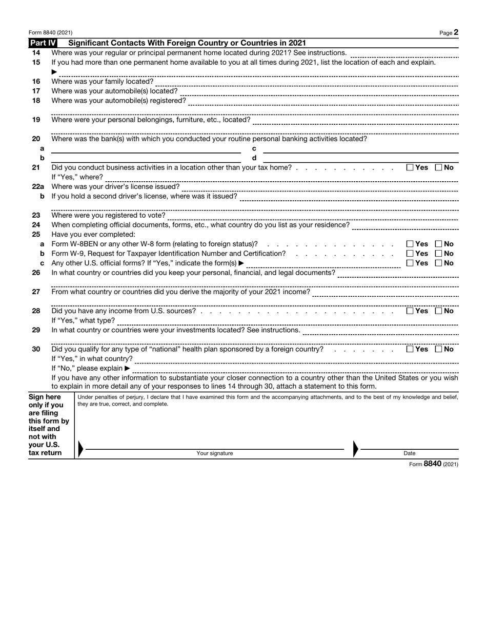 Completing Form 8840 is simple and straightforward. The form requires you to provide basic information about yourself, such as your name, address, and social security number (if applicable). You’ll also need to answer a series of questions to demonstrate your closer connection to Canada than the US.