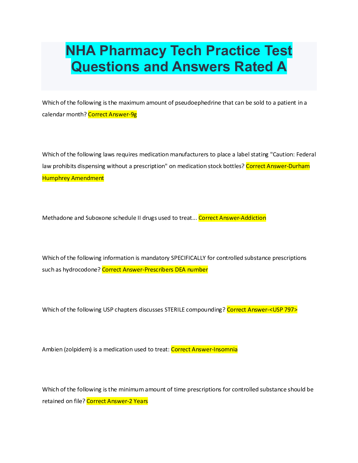 NHA Pharmacy Tech Practice Test Questions And Answers Rated A