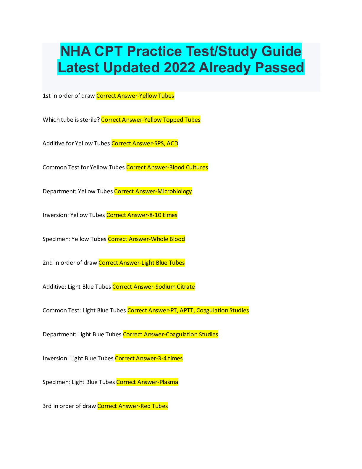 NHA CPT Practice Test Study Guide Latest Updated 2022 Already Passed
