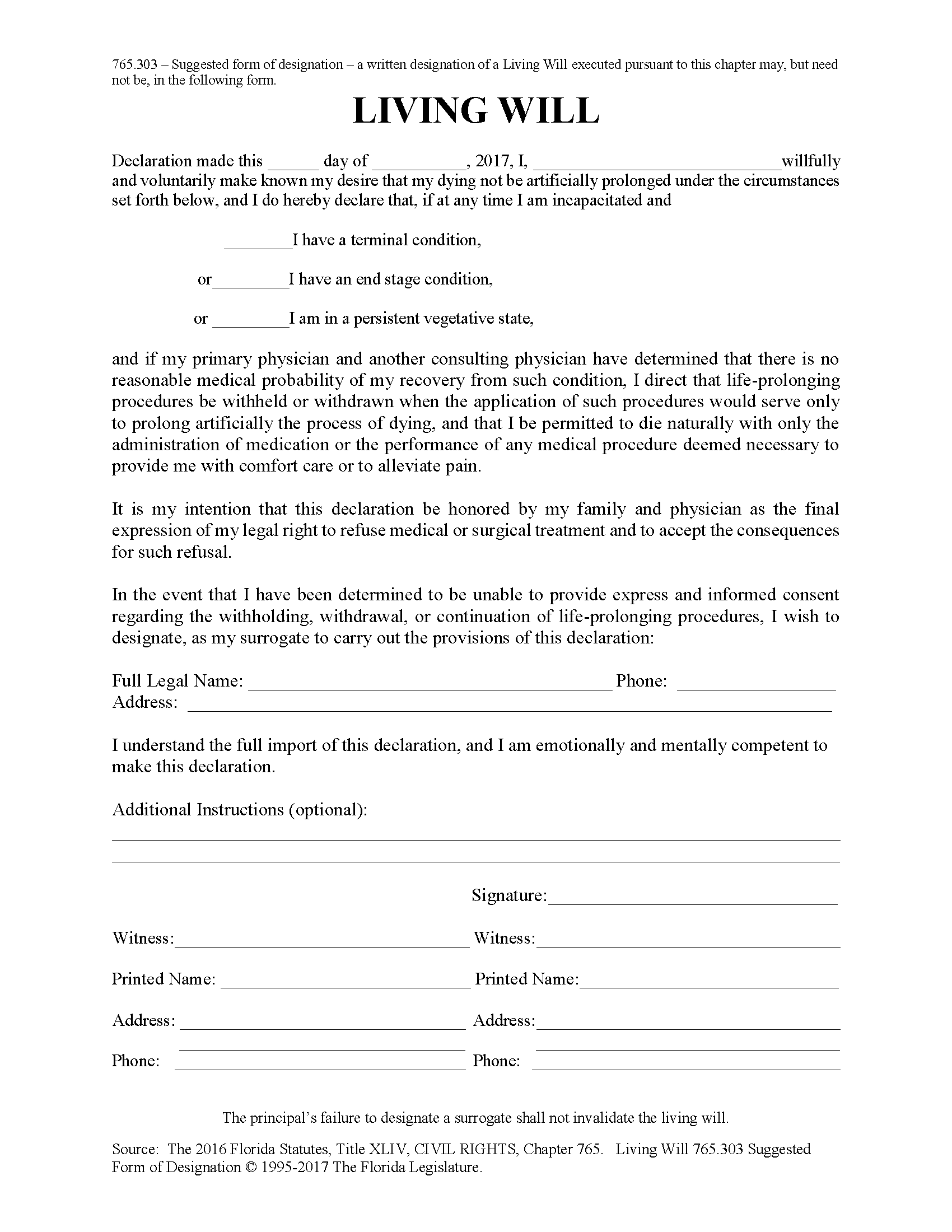 Florida Living Will Form Printable Pdf Download