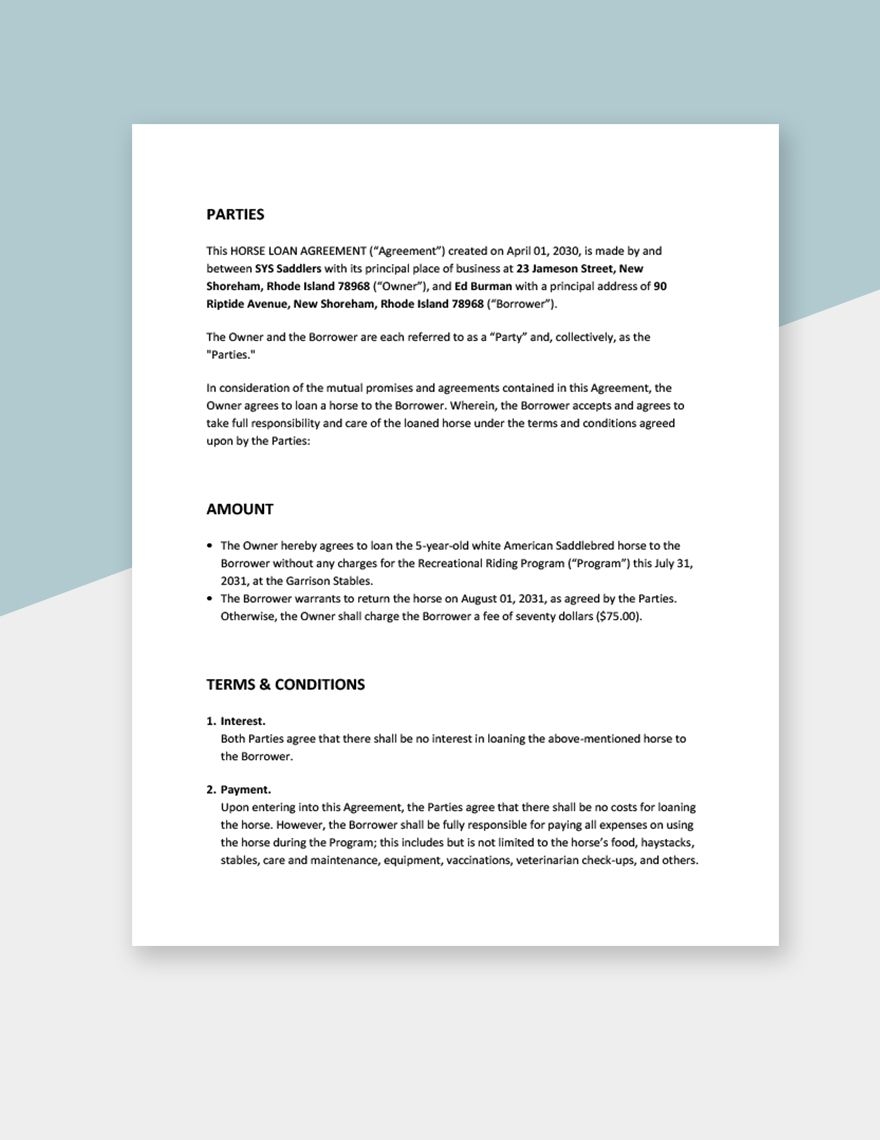 Horse Loan Agreement Template In Word Google Docs Pages Download