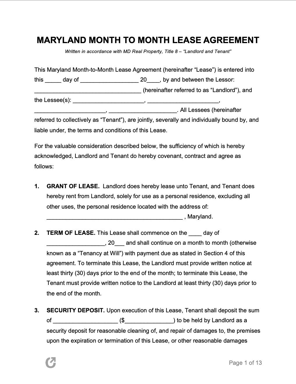 Free Maryland Month to Month Lease Agreement PDF Word