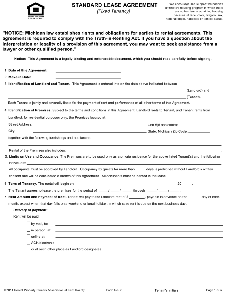 Michigan Standard Lease Agreement Form Rental Property Owners