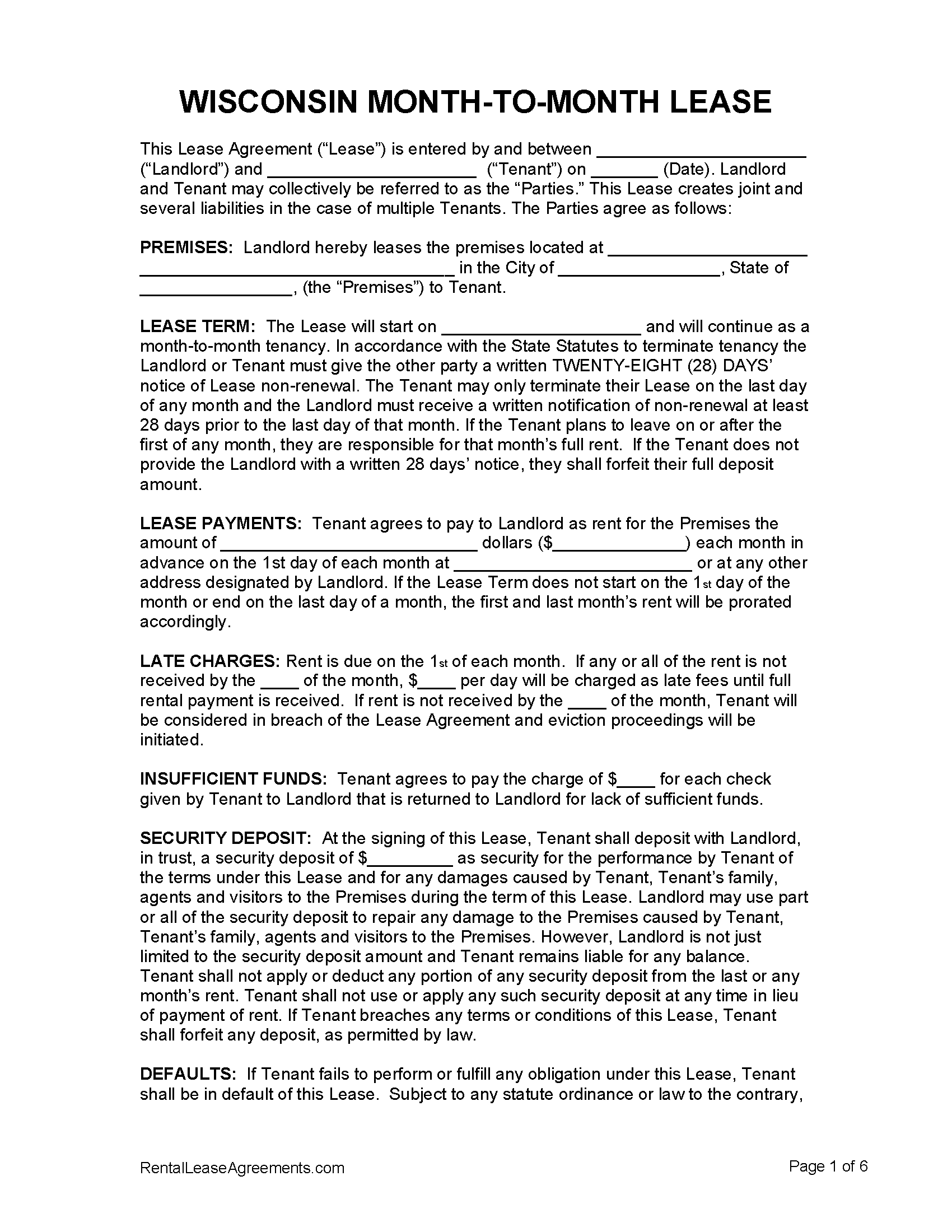 Free Wisconsin Month to Month Lease Agreement Template PDF Word