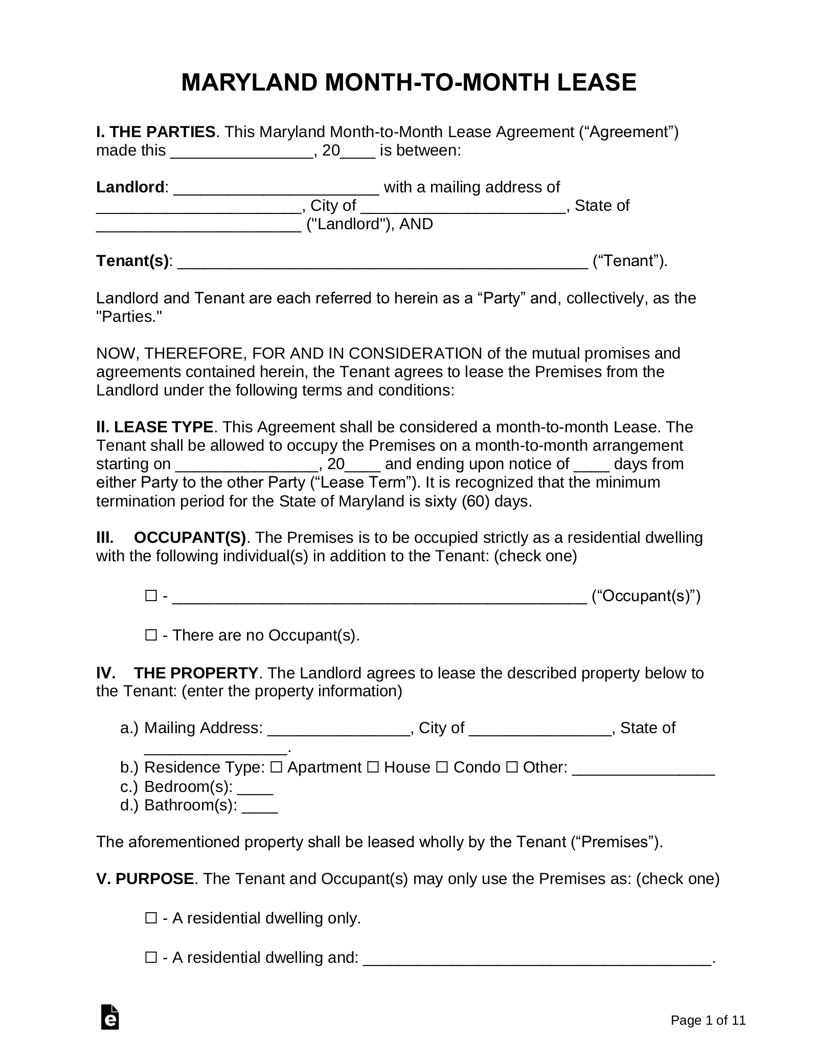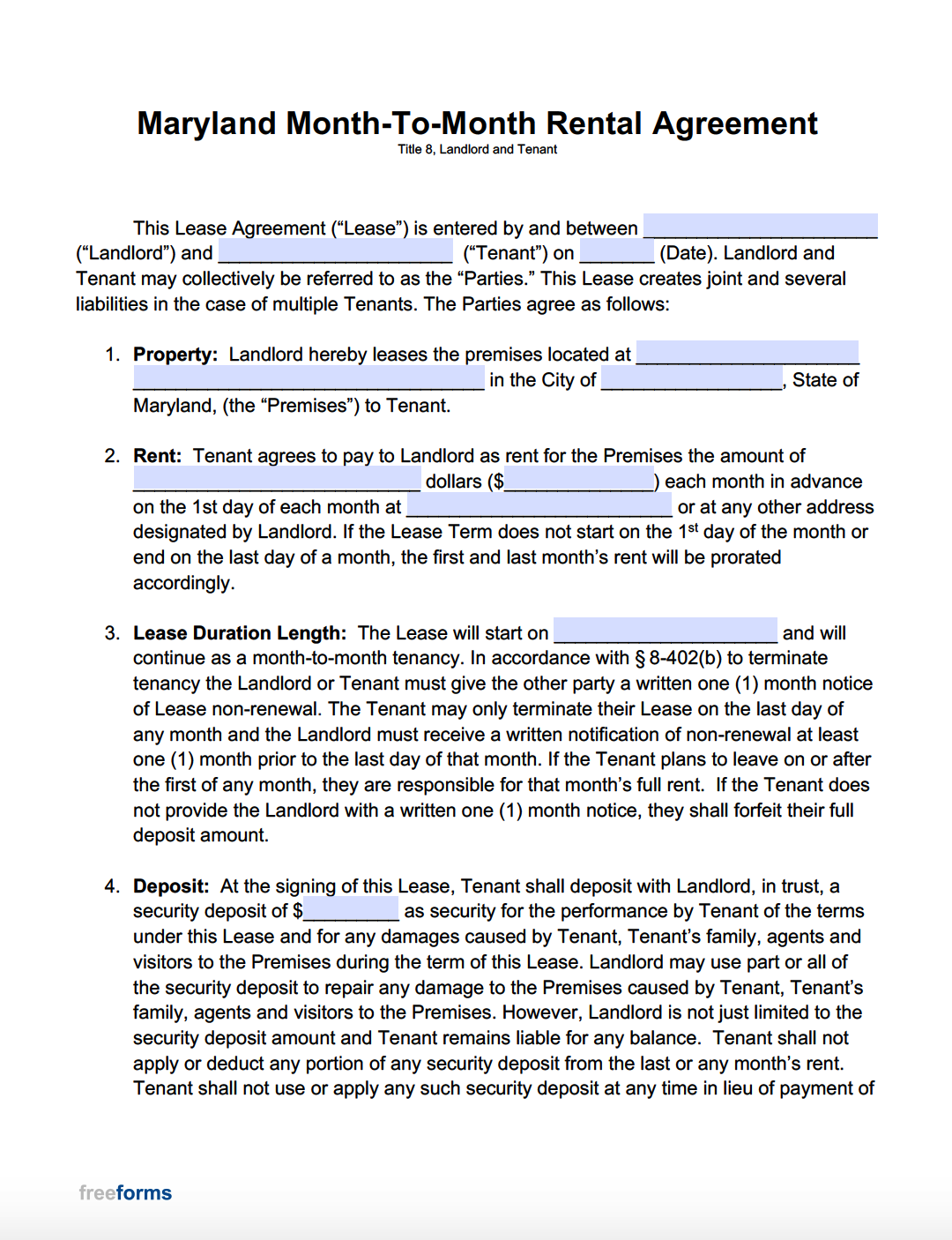 Free Maryland Month to Month Lease Agreement Template PDF Word EForms