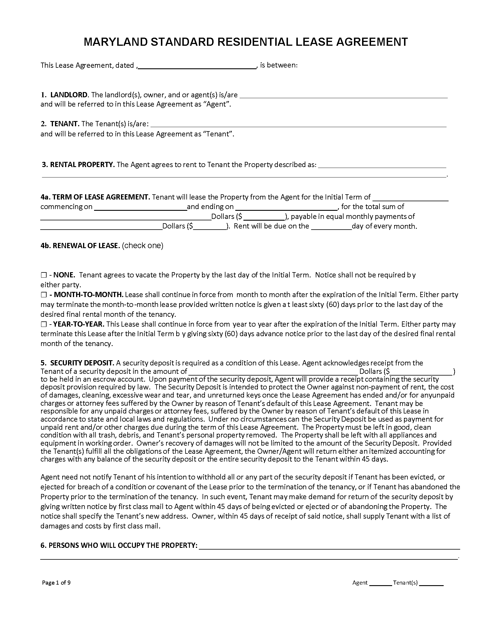 Free Maryland Rental Lease Agreement Templates PDF WORD