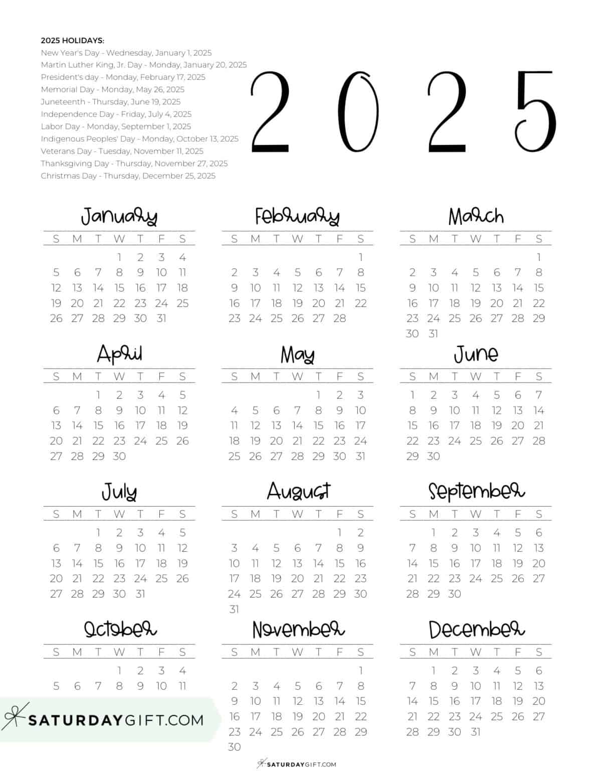 2025 Calendar At A Glance With Holidays Free Eleano Rose